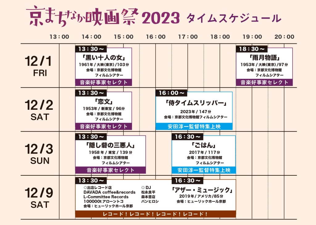 「黒い十人の女」 コモエスタ八重樫(ミュージシャン) 「雨月物語」 いしいしんじ(小説家) 「恋文」 堀部篤史(誠光社店主) 「隠し砦の三悪人」 わたなべとしたか(京まちなか映画祭コーホー)
